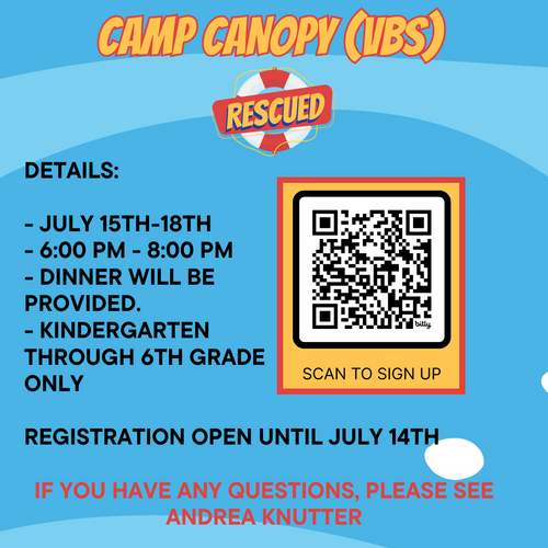 If you would like to donate to Camp Canopy (VBS) to help cover cost of tee shirts and food, please select the appropriate dropdown on the Canopy giving page or drop cash/check into the offering box right inside the front door. THANK YOU!