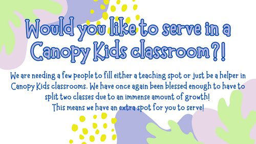 Reach out to Andrea Knutter as soon as possible if you are willing to serve! She can give details, answer questions, etc. THANK YOU to all of our amazing volunteers that jump in to help wherever needed!