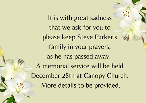 Daniel Zumwalt is looking for 3-4 people to help set up sound equipment that morning. If you are able to lend a hand in carrying things, please let him know on Sunday or reach out to him at daniel@canopy-church.org