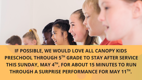 The kids have a surprise that they've been planning during Canopy Kids on Sunday. They will perform this on May 11th during service!
