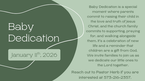 - We will be celebrating Parent Dedications soon. If your family would like to commit your child to the Lord, please reach out to Pastor Herb at your convenience at 573-216-2357.