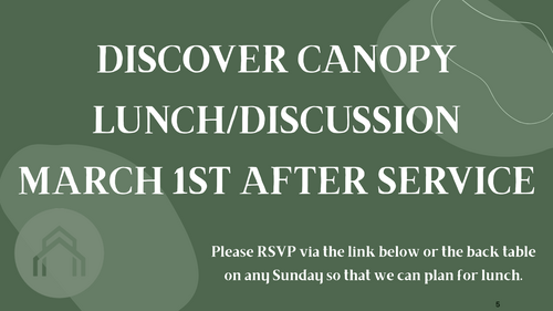 If you’re new or just want to learn more about who we are, what we believe, and how to get connected, this is for you. Join us for a relaxed time to meet leaders, ask questions, and discover your next step at Canopy. Lunch will be provided.