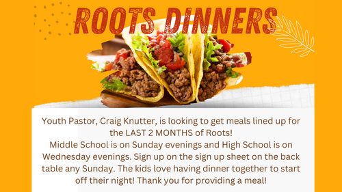 We’d love your help serving our Roots students! Stop by the back table this Sunday to sign up to provide a meal for our middle school and high schoolers and see which dates are still open.