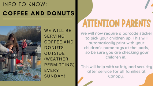 Be sure to check out the new classroom assignments! We now have preschoolers, Kindergarten-2nd Grade and 3rd-5th (meeting in the cabin like normal). If you are interested in volunteering in a classroom, there will be a Canopy Kids Volunteer meeting at 10:15-10:30am (in between services) in the lounge behind the kitchen. Come by!