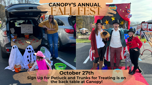 Canopy's Fall Fest is on October 27th directly after service! There will be a Trunk or Treat, Potluck, Bounce Houses, Face Painting, Fresh Apple Cider and a hayride!